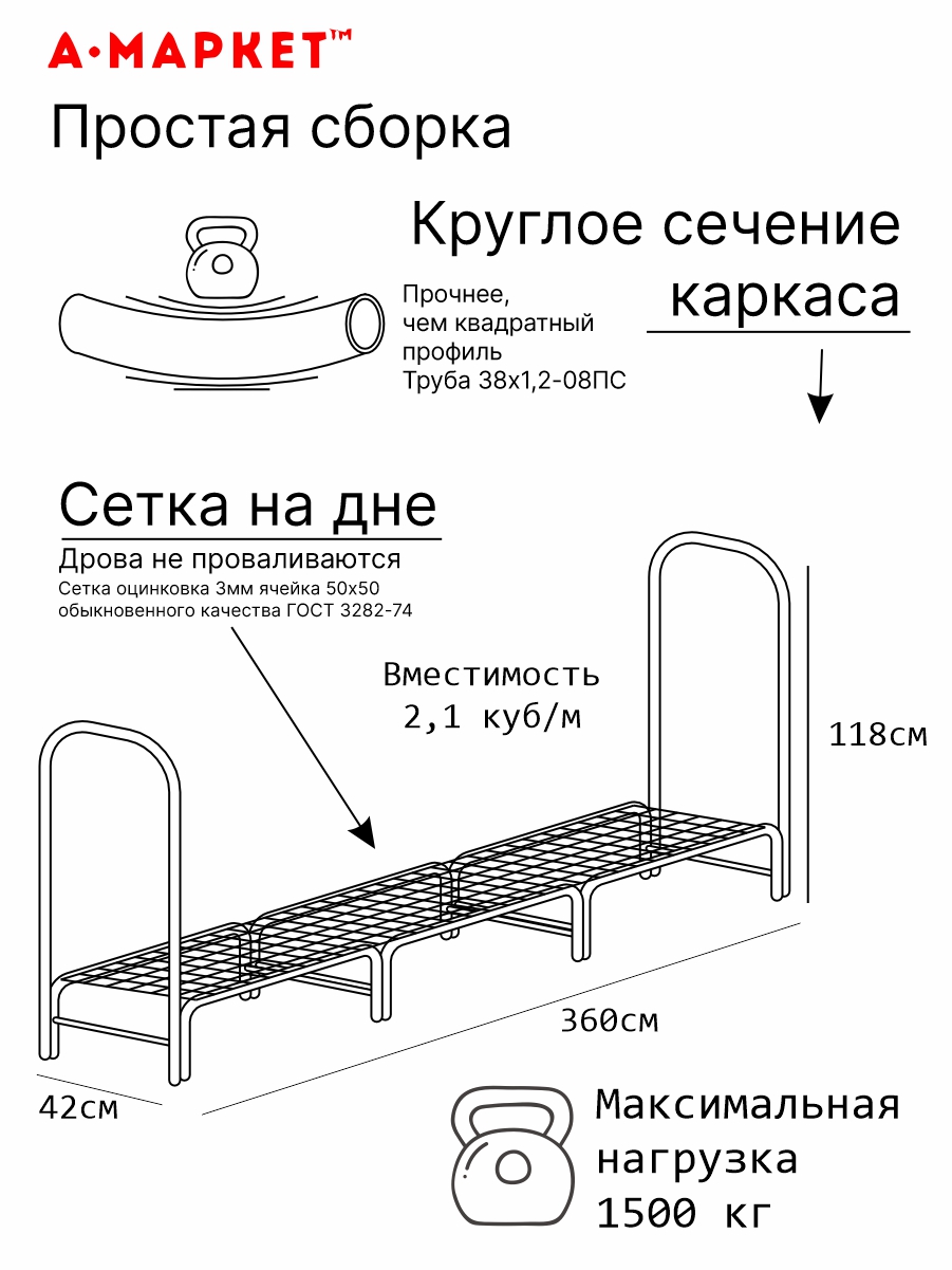 Специальная сетка (оцинковка 3мм ячейка 50*50 ГОСТ 3282-74) позволяет размещать дрова любого размера - они не упадут вниз между трубами. Запас дров хранится не на земле, не соприкасается с влажными поверхностями. Дрова проветриваются с обеих сторон за счет того, что торцы поленницы полностью открыты.