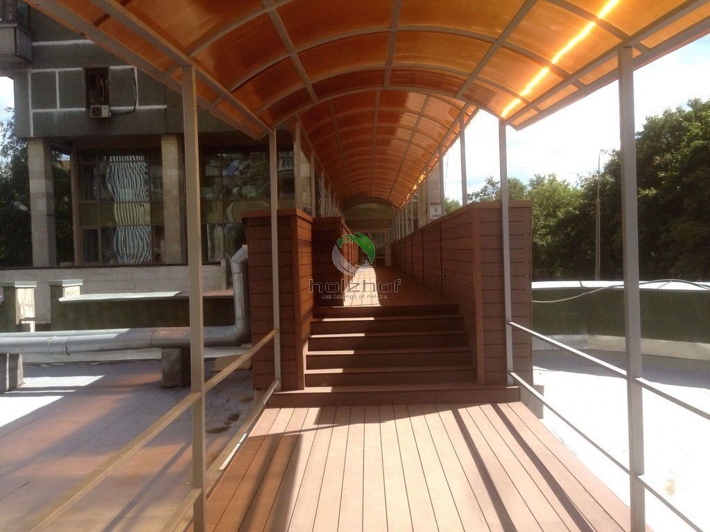 В бизнес-центре на "Войковской" (что на Ленинградском шоссе в Москве) выполнен монтаж переходов между корпусами офисных зданий на кровле. Дорожки выполнены из Универсальной доски из ДПК общей площадью 660 кв.м. Теперь для удобства сотрудников комплекса перейти из одного строения в другие два, занимает не более 1 минуты, а раньше приходилось "путешествовать" по этажам и многочисленным лестничным переходам через первые этажи зданий.